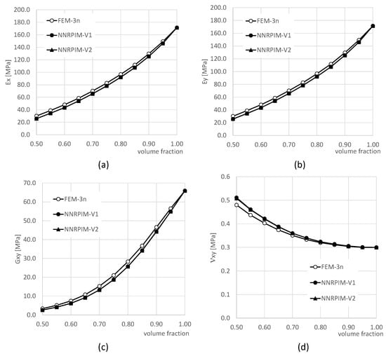 - Micromechanical characterisation: The bulk PUF was modified by incorporating circular holes, enabling the creation of PUFs with varying volume fractions. Subsequently, a homogenisation technique, coupled with finite element methods (FEMs) and two distinct natural neighbour radial point interpolation methods (NNRPIMs), was employed to determine the homogenised mechanical properties of the PUF with respect to its volume fraction. The NNRPIM formulations differed in the consideration of neighbouring nodes within their influence domains: NNRPIMv1 uses only first natural neighbours, while NNRPIMv2 incorporated both first and second natural neighbours. The results demonstrated that both NNRPIM formulations delivered solutions comparable to high-order FEM formulations (e.g., quadratic triangular elements, FEM-6n). However, to achieve variable fields exhibiting a smoothness level equivalent to FEM-6n, NNRPIM formulations require a significant increase in the number of integration points per quadrilateral sub-area integration cell. This resulted in a substantial rise in computational cost, ultimately compromising the overall numerical efficiency of the NNRPIM.