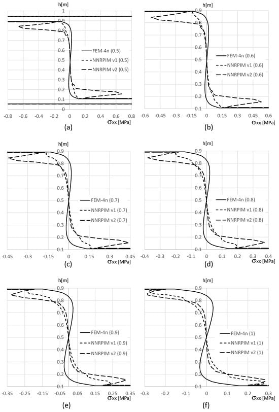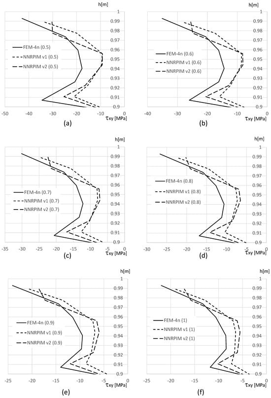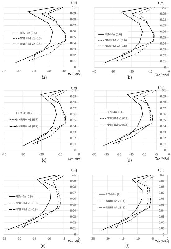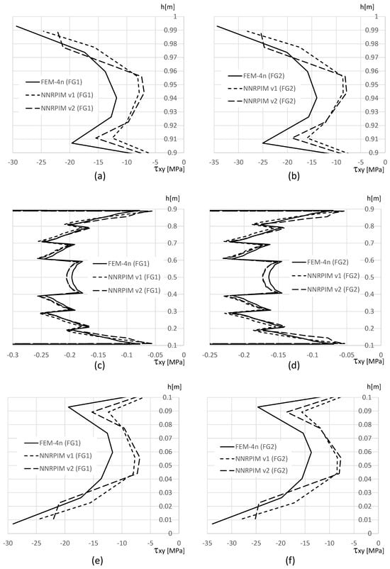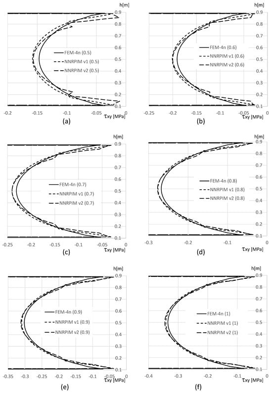 Regarding the shear stress , shown in Figure 19, the FEM-4n and NNRPIM solutions are in accordance with previous studies. In Figure 19a,b,e,f, it is visible that at the free edges of the beam ( and ) due to the size of the support domain, the FEM-4n solutions differ from the NNRPIM solutions. Nevertheless, at the PUF core, Figure 19c,d, the FEM-4n and NNRPIM solutions are actually very close to each other.