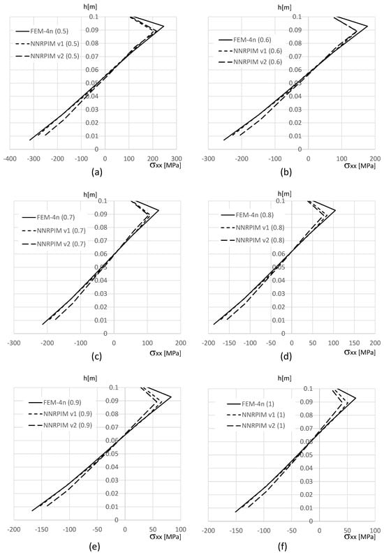 In Figure 18a,b,e,f, it is possible to observe that the NNRPIMv2 values near the edge surface of the beam ( and ) are smoothed. This effect, in addition to the difference between the location of the integration points of the FEM-4n and NNRPIM formulations, explains why the localised results of the NNRPIM, shown in Table 13, are so different from the ones obtained with the FEM-4n. Furthermore, with Figure 18, it is possible to visualise that NNRPIMv1 provides very similar results to the FEM-4n. Concerning the normal stress along m, in Figure 18c,d, all solutions are acceptably close to each other.