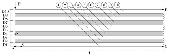 In this subsection, two cantilever beams with aluminium face sheets with approximately functionally graded PUF cores are analysed. As Figure 17 shows, the PUF core possesses eight distinct layers, each one with its own volume fraction. With its right side clamped, the beam is submitted to a localised load N at the top-left corner and it possesses the following dimensions: m and m, for .