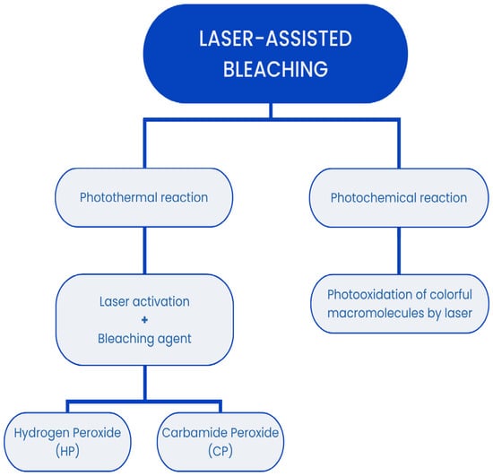 The mechanisms behind laser-assisted tooth bleaching can be divided into two basic methods: photothermal and photochemical reactions (Figure 1). In the photothermal method, the laser acts as an activator and enhancer for the bleaching agent, typically hydrogen peroxide (HP) or carbamide peroxide (CP). The laser’s energy increases the rate of the chemical reactions involved in the bleaching process by heating the bleaching agent, which enhances its effectiveness. This method can lead to the more efficient breakdown of chromogenic compounds and accelerated whitening [2,9]. In the photochemical method, laser light is absorbed by the bleached surfaces and directly induces the photooxidation of the chromogenic macromolecules. The energy from the laser light interacts with the pigment molecules, causing a chemical reaction that breaks down the color-producing compounds, resulting in a lighter shade of the tooth [10,11]. This method leverages the laser’s ability to generate reactive oxygen species that interact with and degrade chromogenic molecules. Each laser used in these procedures is characterized by several critical parameters: the wavelength of the emitted light (measured in nanometers, nm), the power density of the beam (measured in watts per square centimeter, W/cm2), and the type of energy emitted—whether pulsed or continuous [12,13]. Additional features include the pulse rate and pulse duration, which influence the overall effectiveness and safety of the procedure [2,9,10,11]. The choice of laser parameters can significantly affect the outcome of the bleaching treatment, as different wavelengths and power settings can result in varying levels of effectiveness and risk. The energy emitted by a laser must be meticulously controlled during in vivo tooth bleaching, as part of the beam is converted into heat. Excessive heat can increase the temperature of the tooth structure and the surrounding soft tissues, potentially leading to pulp damage, thermal injury, or discomfort [14,15]. Effective cooling mechanisms and the precise calibration of laser settings are essential to mitigate these risks and ensure the safety of the procedure [16,17].