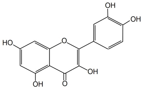 Red onion skins were obtained from a local grocery market (Amol, Iran). The collected skins were washed with cold distilled water and subsequently dried at 60 °C for 15 min. The ash and moisture contents of the skins (g/100 g, dried at 130 °C) were 8.7 ± 0.84 and 8.9 ± 0.42%, respectively. The dried onion skins (DOSs) were ground using an electric grinder and sieved through mesh no. 50 to 140 (100–600 µm) using standard sieves, then stored in glass jars and kept in a cold room (−4 °C) for further use. Chemicals such as potassium acetate (>99%), aluminum chloride (>95%), quercetin (>95%) (Figure 1), isorhamnetin (>95%), and kaempferol (>97%) standards were purchased from Sigma-Aldrich (St. Louis, Mo, USA). Solvents such as ethanol, acetone, water, and ethyl acetate (>99.9%) were obtained from Scharlau (Barcelona, Spain). HPLC-grade methanol, orthophosphoric acid, and water were purchased from Merck (Darmstadt, Germany).