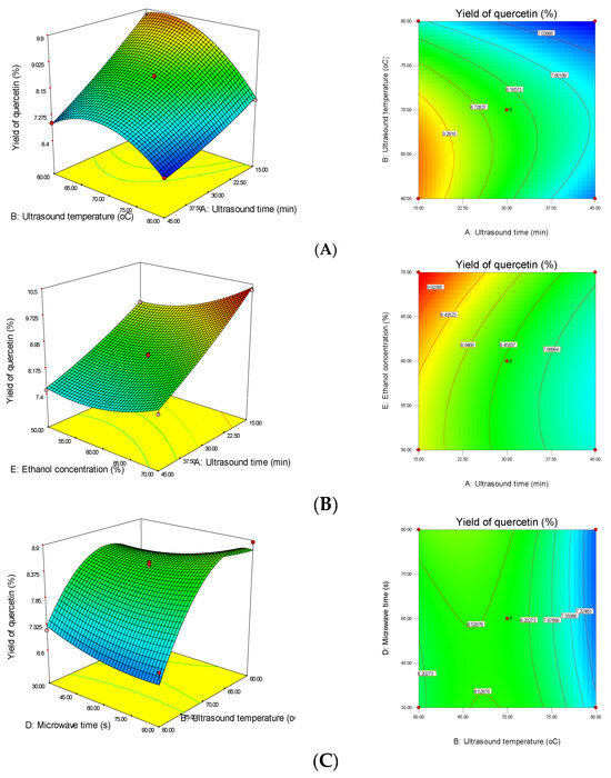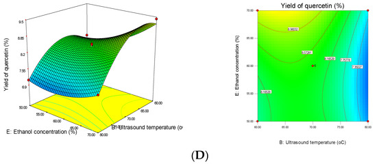 The three-dimensional response surfaces and contour plots for quercetin extraction demonstrate the effects and interactions between the extraction factors (Figure 2A–D). The surface showed an interaction between ultrasound temperature and ultrasound time. It indicated that the extraction yield of quercetin decreased when both ultrasound temperature and time were increased simultaneously (Figure 2A). It is speculated that increasing the ultrasonication time may lead to continuous product release, causing the extraction solvent to become saturated with the extracted products [34]. In addition, an increase in the temperature can accelerate the process of solvent evaporation. It can reduce the contact surface between the solvent and the solid, thereby decreasing the extraction yield of quercetin.