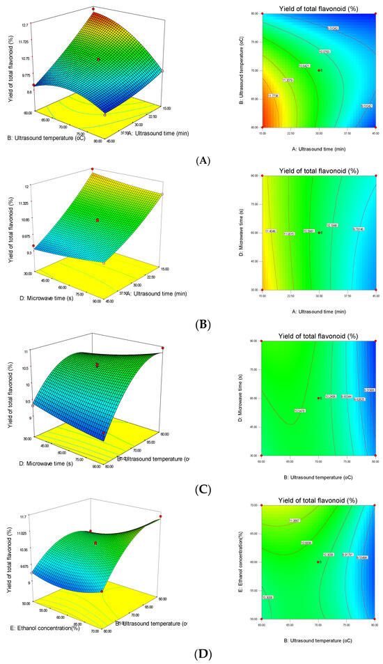 (A–D). Response surface and contour plots for the MUAE of total flavonoids from red onion skin waste with respect to ultrasound temperature and ultrasound time (A); microwave time and ultrasound time (B); microwave time and ultrasound temperature (C); and ethanol concentration and ultrasound temperature (D). The colors range from blue (lower values) to red (higher values), representing the variation in extraction yield.