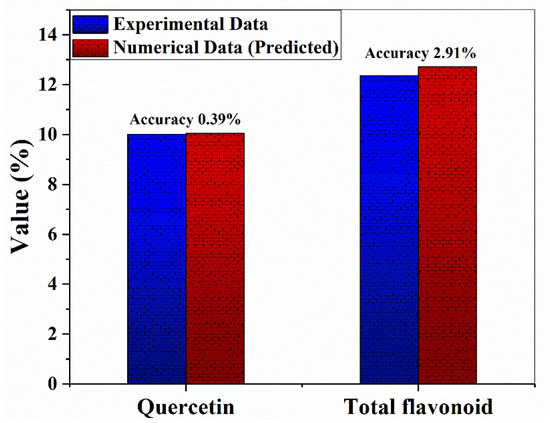 The maximum extraction yield of quercetin at the predicted conditions (10.85%) was achieved at an ultrasound time of 15.49 min, ultrasound temperature of 67.31 °C, solvent-to-solid ratio of 20.33 mL/g, microwave time of 46.83 s, and ethanol concentration of 69.34% (v/v, water). The predicted condition for the extraction of total flavonoids at an ultrasound time of 16.45 min, ultrasound temperature of 64.86 °C, solvent-to-solid ratio of 28.00 mL/g, microwave time of 38.34 s, and ethanol concentration of 69.50% (v/v, water) provided the maximum extraction yield of 12.90%. To verify the validity of the model, the specific conditions for the maximum responses were predicted using response surfaces with numerical optimization as follows: ultrasound time 15.02 min, ultrasound temperature 61.56 °C, solvent-to-solid ratio 39.87 mL/g, microwave time 40.57 s and ethanol concentration 62.43% (v/v, water). The extraction factors were adjusted to be 15.00 min, 60 °C, 40 mL/g, 40 s, and 60% to consider practical limitations and convenient operation. The predicted values for recovery yields were 10.05% for quercetin and 12.72% for total flavonoids. These predicted points were very close to the experimental results for Y1 (10.01%) and Y2 (12.36%), with relative percent deviations of 0.39 and 2.91%, respectively (Figure 4). This strong correlation signifies the suitability of the model to predict the responses at optimal conditions. This study suggests these accurate models and optimal conditions could be significantly helpful for further scale-up of the MUAE process for quercetin and total flavonoid extraction from red onion skin.
