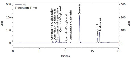 HPLC (Smartline, Knauer, Germany) equipped with a Eurospher I 100-5 C18 (KNAUER, Berlin, Germany) column with dimensions of 250 × 4.6 mm and UV detector 2500 series was used. The column temperature was 30 °C. The detector was set to scan from 200 to 600 nm to monitor the retention time of flavonoids, and the two wavelengths for detecting target compounds were 295 and 365 nm. The injection volume was 20 μL, and the mobile phases were 0.5% orthophosphoric acid in water (solvent A) and methanol (solvent B) with a solvent gradient elution program: 40 to 60% solvent B from 0 to 10 min, 60% B from 10 to 21 min, 60 to 40% B from 21 to 23 min, 40% B from 23 to 26 min, and then held at 40% solvent B until the end of the run at 30 min for column equilibration [33]. The elution flow rate was 1.0 mL/min.