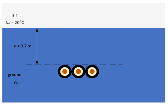 The simplified model shown in Figure 2 was implemented in the ANSYS Fluent software(version 2020 R2 and 19.1). According to the presented model, the power cable line is arranged in a flat, touching arrangement and is embedded in the ground to a depth of h = 0.7 m. The assumption made, as well as a certain simplification, is the homogeneity of materials in the analyzed geometric system. A steady-state simulation was conducted to analyze the heat transfer between power cables and their surrounding material. During the simulation, the energy equation was enabled and the physical properties of various materials, such as density and thermal characteristics (including thermal conductivity and specific heat), were implemented into the model. The energy equation in ANSYS Fluent is complex; however, for the specified computational case, thermal conduction in the solid body is the only heat transfer mechanism that needs to be resolved. The temperature boundary condition in the lower part of the model was set to 20 °C, which aligns with Polish geological and thermal conditions. The design air temperature tair is 20 °C and the convective heat coefficient of 15 W/(m2K) is set on the upper boundary of the domain. These parameters are consistent with the assumptions of the standard [22] and possible unfavourable conditions of heat exchange in the environment.