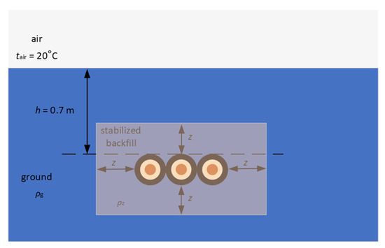The vast majority of cable systems and the associated modelling relate to underground cable installations. The widespread increase in demand for electricity (especially in developing countries) and the constant desire to develop the distribution network, also in unfavourable soil conditions, require cable line designers to use both standard and case-specific design methods. There are a number of aspects of power cable installation design that must be considered to improve the modelling of underground cable systems while maintaining power network flexibility and reliability [1]. In the indicated context, issues related to the operational reliability of power systems are important, as widely described by the author of the publication [2]. The operational reliability of power systems relates, among other factors, to the transmission capacity of cable lines (current-carrying capacity/ampacity), resistance to damage, and economic efficiency [3]. The authors of the paper [4] emphasize the importance of optimizing reliability in cable system design, which also relates to the topic of this research. The indicated factors apply to the entire assumed operational period of underground cable systems (usually a minimum of 30 years). In order to ensure the required parameters, the frequently used design solution is thermal/stabilized backfill in underground power cable systems. The use of this type of solution is widely described, for instance, in [5,6,7]. The most frequently raised issue in studies is how to maintain appropriate and predictable mechanical and thermal properties of the stabilized backfill so as to ensure proper operating conditions of underground power cable lines [8,9]. The thermal resistivity of the soil undoubtedly influences the ampacity of power cable lines laid in the ground. In order to improve the conditions of heat exchange between the cable and the ground (increasing the ampacity), the surrounding soil is most often replaced by stabilized backfill with a lower thermal resistivity. Because the resistivity of the native soil depends on several factors, including grain composition, grain size and moisture content [10,11], the use of stabilized backfill allows for uniform heat exchange conditions between the power cables and the surroundings. Uniform and good heat exchange conditions help to avoid local thermal exposure of cables in places where the thermal resistivity of the native soil is high [3,12]. Local overheating of cables leads to the rapid aging of their insulation, and it reduces the operational durability of cables [12,13,14]. Stabilized backfill is also beneficial to avoid mechanical stress on the cables. The native soil may contain stones and other sharp elements, whereas the backfill is homogeneous and free from damaging fractions [10]. The use of stabilized backfill also makes it possible to avoid the occurrence of so-called dry zones in underground installations. Dry zones occur as a result of local moisture migration due to the heating of power cables’ surroundings by Joule heat. As a consequence, the thermal resistance of the surrounding soil increases and the long-term permissible temperature for a power cable’s insulation may be exceeded [15]. Therefore, both designers and power system operators are concerned about maintaining stable and optimal thermal conditions around the installed power cable lines [11,16,17]. In addition to the technical arguments indicated, economic issues are also important for the use of stabilized backfill [8,18]. Taking into account the above information, the main issue when designing a cable line is determining its long-term ampacity correctly in order to avoid thermal damage to the cables. If no stabilized backfill is used, this is not a major problem. In this respect, the use of common standards [19,20,21,22] is sufficient, and their provisions can be used to verify numerical calculations [3,23,24,25,26]. As noted by the authors of article [26], the ampacity determined based on standards [20,21,22] is overestimated when compared to numerical models.
