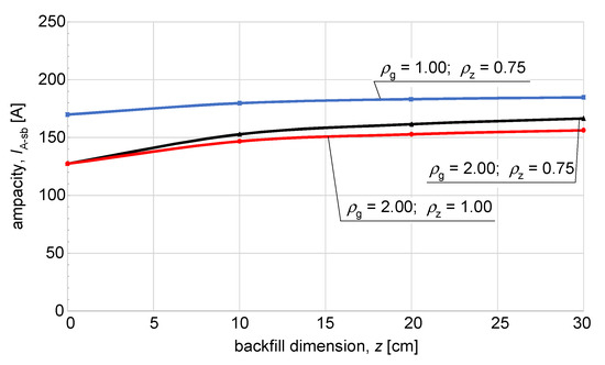 Ampacity (IA−sb) of the power cable line (240 mm2) as a function of the stabilized backfill dimension (z), its thermal parameters (ρz), and native soil thermal parameters (ρg).