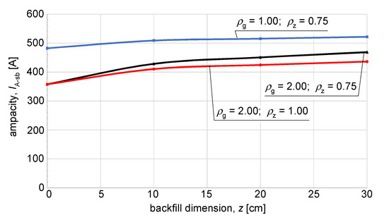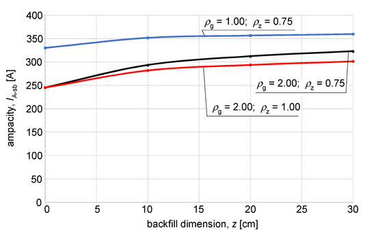 Ampacity (IA−sb) of the power cable line (35 mm2) as a function of the stabilized backfill dimension (z), its thermal parameters (ρz), and native soil thermal parameters (ρg).
