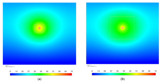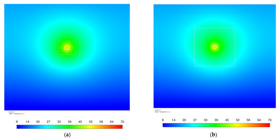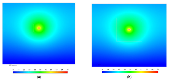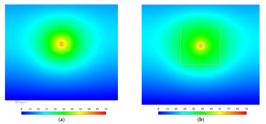 Based on the presented temperature field drawings, it can be concluded that in cases where there is a relatively high value of native soil thermal resistivity (here ρg = 2.0), the heating area around power cable lines is much wider compared to soil with low thermal resistivity (here ρg = 1.0)—Figure 9 vs. Figure 10, and Figure 11 vs. Figure 12. Comparing cases (a) and (b) for Figure 9, Figure 10, Figure 11 and Figure 12, it can be seen that with the increase in stabilized backfill volume, the area of increased ground temperature also increases.