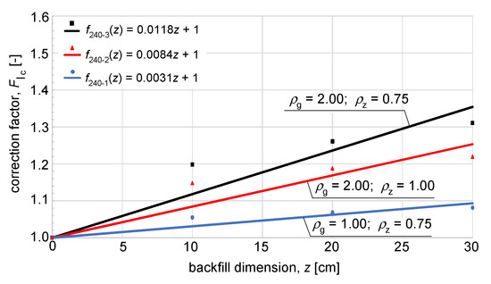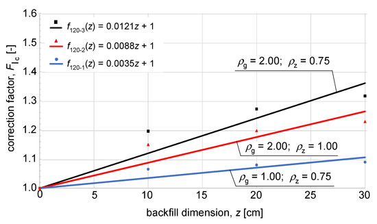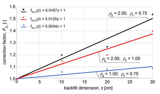 Figure 13, Figure 14 and Figure 15 show graphical relationships between correction factor values and stabilized backfill dimensions. The given dependencies have been linearized to a family of straight lines intersecting on the coordinate system at point (0; 1.0)—this point physically means a calculation case for an arrangement without stabilized backfill.