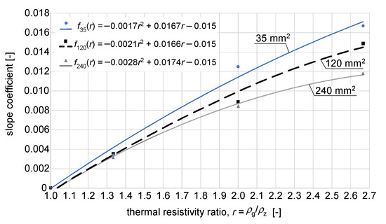 In a further stage, the description of the family of straight lines was generalized. Figure 16 shows the relationship between the slope coefficients of the family of lines defined in Figure 13, Figure 14 and Figure 15 and the ratio (r) of the thermal resistivity of the ground to the thermal resistivity of stabilized backfill.