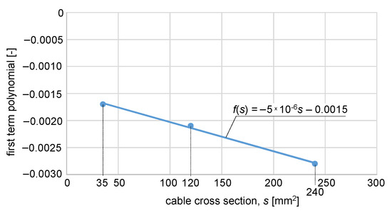 As can be seen, the relationship for all three types of power cable lines considered is a second-degree polynomial (in general: ax2 + bx + c). Coefficient “c” is constant for all cases and coefficient “b” changes from 0.0166 to 0.0174, so the relative difference is below 5%. The changes in coefficient “a”, for various cross-sections, are definitely more significant, so the strongest dependency is between coefficient “a” and the cross-sectional area. To generalize the first term of the polynomial, the function in Figure 17 has been presented.
