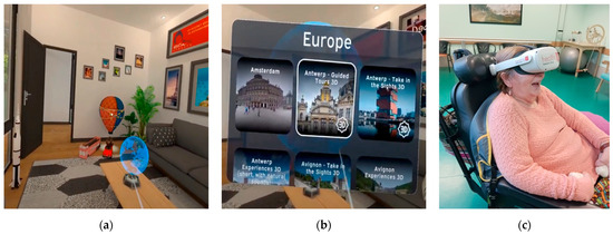 Screenshots of some virtual scenarios proposed for first contact with IVR: (a) virtual living room in Alcove experience; (b) inside the virtual guided visits tours settings in Europe; (c) participant in sitting position and interacting with the head-mounted display.