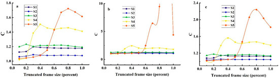 The curves depicting the variations in the roughness correction coefficient with respect to size were obtained using different formulas ((a): Eq-M; (b): Eq-Zi; (c): Eq-X; (d): Eq-Zh; (e): Eq-L; (f): Num). The roughness correction coefficients for all the samples showed minimal variation when using Eq-L. With the exception of a pronounced change observed in the curve when using Eq-Zh, the roughness correction coefficient for shear-cut samples S1, S2, and S3 remains relatively stable when using different formulas with respect to size. In contrast, the roughness correction coefficient for tension samples S4 and S5 exhibits significant variations with size when using the other formulas, except for a minor change observed in the curve when using Eq-Zh. Eventually, the coefficient gradually stabilizes. The suggested coefficient being less than 1 results in the opposite trend in the variation in the curve when calculating with Eq-Zh compared to the other formulas.