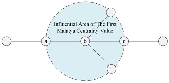 The impact area of the first Malatya centrality value on the graph is given in Figure 1. The centrality value of each node is calculated according to the nodes directly connected to it. The first Malatya centrality value shows the logic of calculating the relative strength of a node relative to its neighbors. Assuming we want to compute the first centrality value of node ‘b’, the nodes ‘a’, ‘c’, and dashed nodes should be taken into consideration since nodes one step away are taken into consideration for computing the first Malatya centrality values. All nodes are one step far away from the ‘b’ node, these nodes are regarded as in the first Malatya centrality influential area (region). The First Malatya centrality value of a node involves using the degrees of nodes one step away from that node.