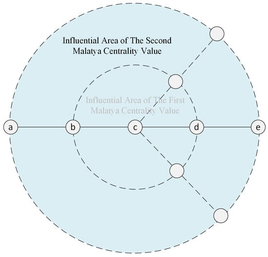 Assume that the aim is to compute the second Malatya centrality value for node ‘c’. The nodes ‘b’ and ‘d’ and the dashed nodes on the inner circle are taken into consideration for computing the first Malatya centrality value for node ‘c’. This process is carried on for all nodes. The next step is to compute the second Malatya centrality value. All nodes two steps far away from node ‘c’ are taken into consideration for computing the second Malatya centrality value of node ‘c’ as seen in Equation (3) (Definition 4). To consider nodes two steps far away, the first Malatya centrality values should be used as similar to degree usage (as seen in Equation (2), Definition 1). To calculate the second Malatya centrality value of a node, the first Malatya centrality values of the neighbors of the related node are used. This means that since the degrees of nodes that are one step away are used in the first Malatya centrality value, using the first Malatya centrality value in computing the second Malatya centrality value means that all nodes that are two steps away are included in the computation (Figure 2).