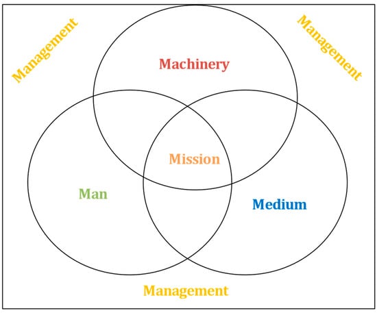 Accidents in the construction industry are often attributed to a combination of factors, necessitating comprehensive risk assessment and management approaches. Collaboration among diverse teams on construction sites adds complexity and underscores the importance of analyzing safety risks by occupation or project phases to ensure comprehensive accident prevention strategies. This study seeks to improve safety outcomes on various construction projects through attribute-based risk analysis and customized safety plans. Acknowledging the complex interplay of various factors, the 5M model, illustrated in Figure 1, is employed to analyze root factors to prevent future accidents [4]. Such a model helps identify the root causes of accidents and attribute them to five main groups: man, machinery, medium, management, and mission [5,6]. This study suggests analyzing these risk factors using the 5M model and categorizing them according to different project phases to enhance their mitigation process.