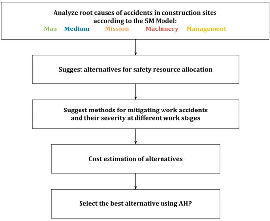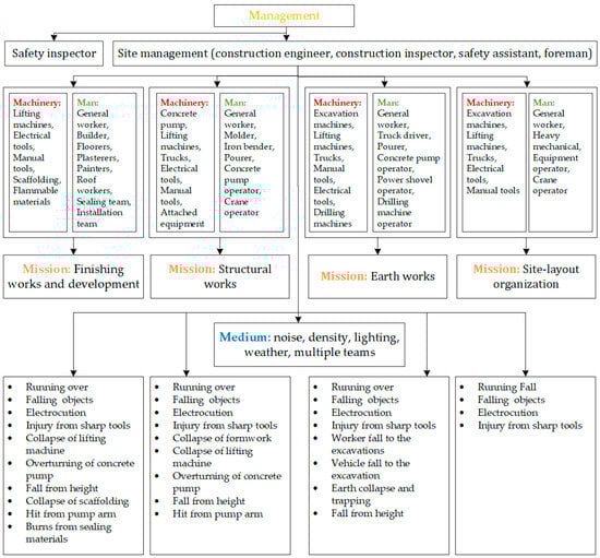 The research methodology commences with an analysis of the fundamental risk factors contributing to fatal accidents at construction sites. Unlike similar research studies that analyze root factors of construction accidents [54,55,56], the proposed root cause analysis is carried out based on the 5M method (man, medium, mission, machinery, and management) and is further deepened by categorizing these factors according to various project phases, encompassing earthworks, structural works, finishing works, and site layout organization (Figure 3). The proposed model is designed to gain insights into the occurrence of fatal accidents across different project stages to enhance risk management practices.