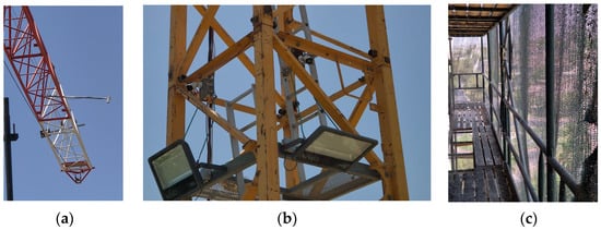 Advanced mitigation solutions. (a) Crane-installed cameras. (b) Crane-installed cameras and lights. (c) Fall-avoidance nets on scaffolding.