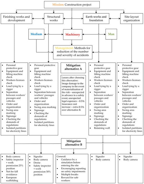 The use of such advanced technologies for enhancing risk mitigation is allowable if safety resource allocation in the project is sufficient. Figure 5 suggests risk mitigation activities in each project phase that can be implemented according to alternative A and additional advanced risk mitigation methods for upgrading safety measures according to alternative B. AHP enables the selection of the most suitable alternative, ensuring optimal results while satisfying project budget constraints and meeting the needs of entrepreneurs, management, and execution teams on-site.