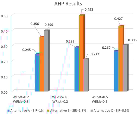 Finally, by applying the AHP decision model described in Figure 6, the alternative with the minimum final ranking score, presenting minimum cost and minimum risk, is selected for each one of the three AHP tests examined. This way, the proposed approach contributes to contractors’ decision-making in allocating safety resources to prevent work accidents based on their preferences regarding safety costs and risks.