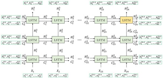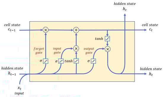 LSTM networks were first introduced by Hochreiter and Schmidhuber in 1997. LSTM is a type of RNN that solves the short memory problem of traditional recurrent neural networks, which are bad at retaining long-term information. LSTM networks can remember information for long periods. In Figure 1, the general architecture of an LSTM cell is depicted, where the gates and the cell state stand out as its most important elements. A gate has a feed-forward layer, followed by a sigmoid activation function and then a pointwise multiplication step. An activation function transforms the vector before computing the loss calculation. The cell state is the memory unit of the network. It is used to encode dependencies and long-term relationships through gates. Each LSTM cell has three inputs, , , and , respectively representing the input at time t, the previous hidden state, and the previous cell state, along with two outputs and , respectively representing the current hidden state and current cell state [].