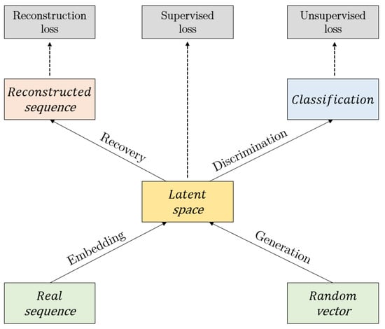 GANs were not created specifically for time series data; they are mainly used with images, and as such do not perform well regarding specific time series properties. The TimeGAN framework was introduced by Yoon et al. [] in 2019. It seeks to overcome these limitations when generating synthetic data sequences based on a real dataset.