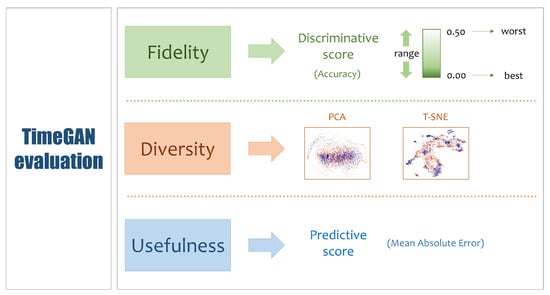 The authors of TimeGAN used three metrics as criteria to evaluate the generated data: (1) fidelity, (2) diversity, and (3) usefulness []. The fidelity metric indicates that the sample series should be indistinguishable from the real data. The diversity metric refers to the requirement that the distribution of the synthetic data should be similar to that of the real data. Finally, the usefulness metric means that the synthetic data should be as useful as the real data for solving predictive tasks. Figure 3 summarizes these three evaluation criteria.