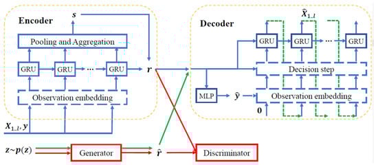 RTSGAN is a framework proposed by Pei [] that allows for the generation of multidimensional time series data. The RTSGAN architecture has two main components: (1) an encoder–decoder module, and (2) a generator module. Their schematics can be seen in Figure 4. The encoder–decoder (autoencoder) module learns to encode each time series instance into a fixed-dimensional latent vector, from which the time series is reconstructed. The generator module uses a Wasserstein GAN (WGAN) to produce vectors in the same latent space as the autoencoder. The time series are generated by feeding latent synthetic vectors produced in the generator into the decoder.
