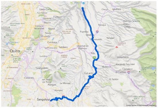 The data in the built real dataset were obtained mainly from the data generated by a vehicle driven by the same person traveling a route for about 50 min. The route crosses Sangolquí-Pifo Avenue and then continues along the Alpachaca Corridor until reaching the Mariscal Sucre International Airport in the Tababela sector; the map of the route can be seen in Figure 5.