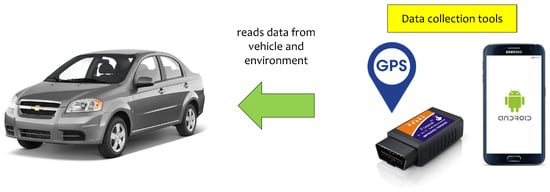 All of the collected data received the respective authorizations from the data owners for use in this research through their written consent. These data were read from the vehicle and recorded every second by the Car Scanner Pro app installed on an Android smartphone placed inside the vehicle. This app was connected via Bluetooth to an OBD-II dongle connected to the vehicle’s OBD-II interface. On-Board Diagnostics II is a vehicle diagnostic system that monitors, among others, the emissions, mileage, speed, and temperature of the car; almost all modern light vehicles of American origin manufactured since 1996 incorporate an OBD-II diagnostic port. The ISO-15765-4:2021 standard specifies the communication requirements between the Controlled Area Network (CAN) and the diagnostic system (OBD-II) of a vehicle. The schematic of the interconnection of these components is shown in Figure 6. Depending on the vehicle’s type, equipment, and make, this app can obtain more or less data about the car.