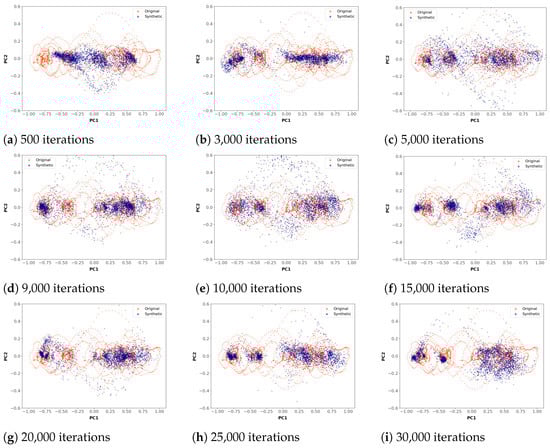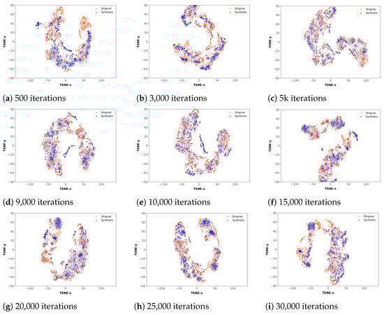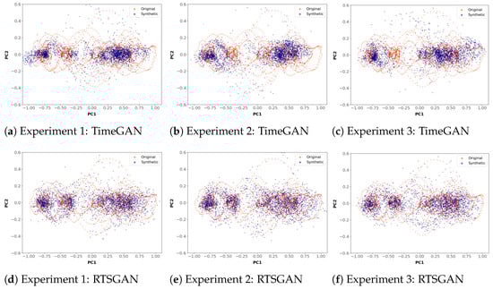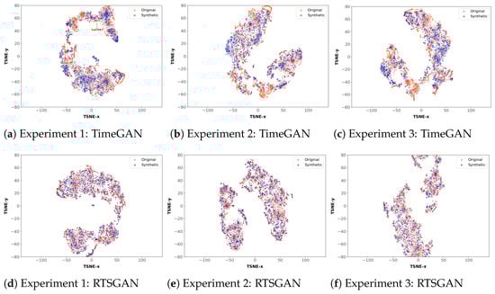 Diversity evaluation. Although there is no direct visual way to assess the appropriateness of synthetic data, the PCA and T-SNE techniques can be used as qualitative assessment metrics. PCA is an algorithm that finds a set of principal components that are orthogonal to each other, where each component captures the largest variance of the data after accounting for the variance accounted for by the previous components. On the other hand, T-SNE is a nonlinear approach that reduces the dimensionality of the data, seeking to maintain the closeness between the points of the original dimensions in the lower dimensional representation. T-SNE uses a T-distribution to represent the probabilities in the lower-dimensional space. This process is the opposite of that used by PCA, which seeks to obtain the highest variance []. Both of these methods follow the expectation that the two-component scatter plots of the synthetically generated and the original points should be as similar as possible. These plots provides a visual representation showing whether the distribution of the generated data maintains similar characteristics to the original data distribution.