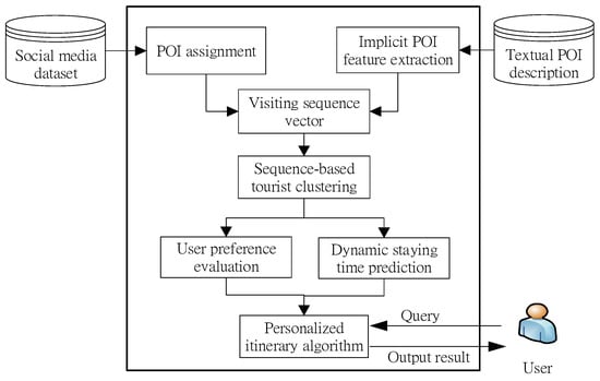 The framework of the proposed tour recommendation system is visually illustrated in Figure 1. First, for each photo record in the social media dataset, we need to find the POI closest to the photo’s GPS coordinate and assign the POI as the attraction the user is visiting. Second, this research uses the implicit feature extracted from the textual description of the POI as a POI representation through appropriate text-preprocessing and feature-reduction techniques. Third, to make the recommendation result more accurate for each tourist, tourists are further clustered into several disjointed sub-groups based on their similarity to their visiting sequence. Fourth, before planning an itinerary, user preference for each POI must be inferred according to historical records in the social media dataset. Fifth, since staying time might vary for different users, time slots, and POIs, dynamic staying time prediction is proposed using the Non-negative Matrix Factorization (NMF) algorithm. Finally, a personalized itinerary algorithm is proposed to consider user preference, dynamic staying time, and time limitation. The input to the proposed algorithm includes the user’s previous visiting sequence, the request, and the time limitation, while the output is the personalized itinerary with the highest preference score and the longest remaining time. Each critical component will be introduced in detail in the following sub-sections.