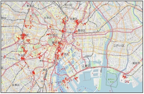 This research uses the Web Application Programming Interface (API) to obtain photo information from the social media Flickr. In total, 599,353 photos were taken in Tokyo from 1 January 2016 to 31 December 2019. Each photo record contains the user ID, date taken, latitude, longitude, tags, place_id, etc. After removing records without latitude and longitude, a total of 599,026 photos taken by 6005 users is found. Table 1 shows some example check-in records. Figure 3 displays the distribution of user check-in points on the map. From the distribution of check-in points on the map, we find most records appear in famous attractions in Tokyo, such as Meiji Jingu in Shibuya, Tokyo Skytree in Sumida District, Sensoji Temple in Taito District, etc.