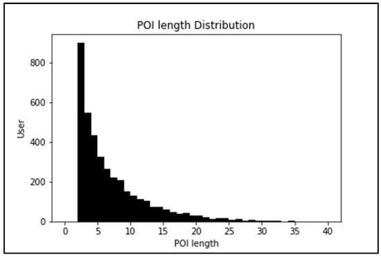 To group users into clusters based on the similarity of their visiting sequences, it is necessary to transform all user’s visiting sequences into a fixed length. The distribution of the user’s visiting sequence length is shown in Figure 4. Note that the sequence with a length of two is removed. Based on the observation from the figure, we determine that the length of visiting sequences is fixed as 9. Thus, the visiting sequence vector will be 1602 dimensions since the length of a visiting sequence is 9 and the dimension of each implicit POI feature vector is 178.