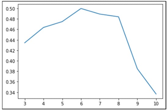 Next, users will be further clustered into several disjointed sub-groups by K-means based on the visiting sequence similarity between tourists. The silhouette coefficient analysis [35] is conducted to determine the appropriate K value. Figure 5 shows the silhouette coefficient when K is changed from 3 to 10. Based on the figure, the K value is set as 6 because it has the highest silhouette coefficient. After clustering, all users in the dataset are divided into six clusters. There are 1241, 904, 549, 344, 474, and 430 tourists in each group, respectively. For each group, NMF is employed to derive staying time, time slots, and POIs for all users.