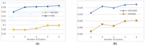 (a) The performance metrics of MAP@5 and P@5 (b) the performance metrics of NDCG@5 and MRR@5 when the number of clusters is from 2 to 6.