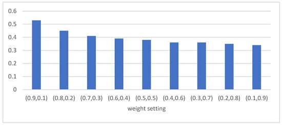 The MRR@5 of the proposed recommendation system when different weight settings of user preference are applied.