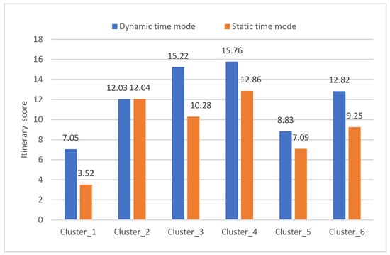 Dynamic staying time means POIs in different time slots will have different staying times. On the other hand, static staying time implies that the POIs have the same staying time regardless of the time slot. In this study, dynamic staying time is applied in the proposed system. To know the benefit of the proposed dynamic staying time concept, in the following discussion, we will observe the average number of recommended POIs and the average itinerary score for each cluster when the number of clusters is six.