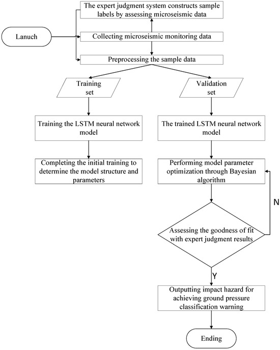 3. Model Construction: In the model construction process, the time series characteristics of microseismic energy changes are taken into account. Python 3.11 is employed to construct the LSTM network model, which comprises an input layer, a hidden layer, and an output layer. Additionally, a Bayesian optimization algorithm (BO) is utilized to optimize the parameters. The Python programming language was employed to implement the model on the Jupyter platform. The sample data are divided into two distinct sets: a training set and a verification set. The training set is employed to train the model, while the verification set is utilized to test the trained model and optimize the parameters through the Bayesian algorithm until the optimal neural network model is identified.