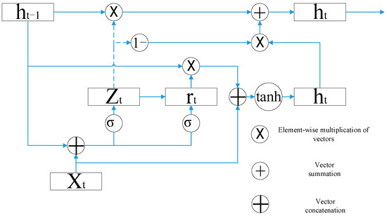 In the equations, ωr represents the weight for the reset gate, ωz represents the weight for the update gate, tanh denotes the hyperbolic tangent function, and σ represents the sigmoid function. The parameters , , and ω0 are trainable parameters in the model [29,30].