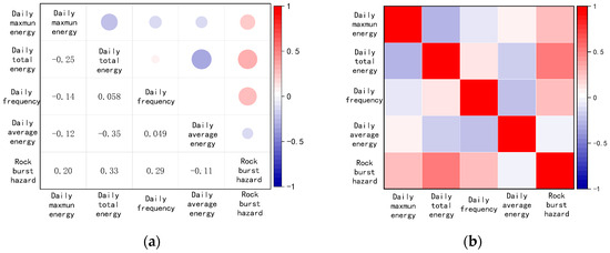 The correlation coefficient diagram calculated by Pearson correlation coefficient and Spearman correlation coefficient is shown as Figure 4. It can be seen that the daily total energy, daily frequency, and daily maximum energy are positively correlated with the impact risk, and the correlation between the daily average energy and the impact risk is close to 0. Therefore, the model in this paper selects daily total energy, daily frequency, and daily maximum energy to establish a data set.