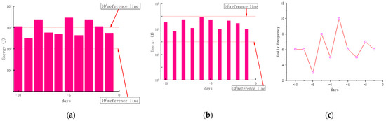 Microseismic monitoring data: (a) the daily maximum energy value of the first 10 days at time t; (b) the daily total energy value of the first 10 days before the time of t; (c) the daily maximum frequency of the first 10 days at time t.
