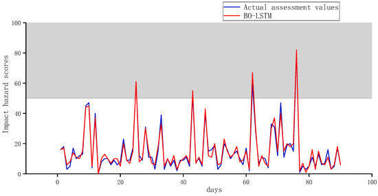 The results of the evaluation are presented in Table 2. The mean absolute error (MAE) and mean absolute percentage error (MAPE) values of the bidirectional long short-term memory (BLSTM) model are the smallest, with values that are 0.038369 and 0.195484 lower than those of the gated recurrent unit (GRU) model and 0.052916 and 0.310299 lower than those of the one-dimensional convolutional neural network (1DCNN) model, respectively. Furthermore, the variance accounted for is closest to 1, indicating that the predicted value of the impact risk and the true evaluation value are well fitted. In the MSE value evaluation, the GRU model outperforms the 1DCNN in the first three evaluation indicators due to the greater susceptibility of the mean square error (MSE) to large errors and the greater sensitivity of the GRU model to outliers. The MSE values of the two models are comparable, yet the evaluation results are inferior to those of the BO-LSTM model. Consequently, the BO-LSTM model is more reliable for impact risk prediction, with a relatively high degree of accuracy.