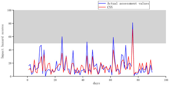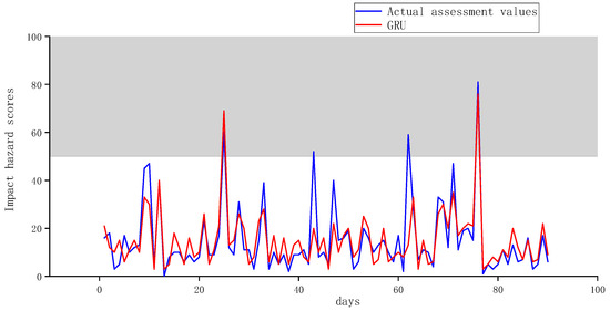 In order to verify the prediction performance of the BO-LSTM model, it is compared with two other models: a GRU (a recurrent neural network model) and a 1DCNN (a one-dimensional convolutional neural network model). It can be seen from Figure 6, Figure 7 and Figure 8, the BO-LSTM model demonstrates the most accurate prediction of impact risk, with precise predictions for the four events of medium and strong impact risk. The GRU model is the second-best performer, with two accurate predictions for the four events of medium impact risk and strong impact risk. The 1DCNN prediction effect is the least accurate, with only one accurate prediction made for the four events of medium impact risk and strong impact risk.