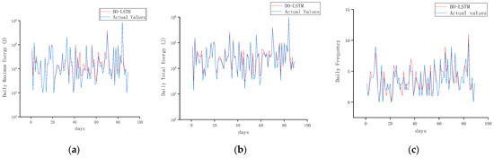 In order to further verify the application value of the BO-LSTM model in microseismic energy prediction of rock bursts, the model is used to predict the daily maximum energy, daily frequency, and daily total energy value and compared with the actual observation value in the field. As illustrated in Figure 9a–c, the model demonstrates an accurate prediction of four microseismic energy events above 105 in the prediction of the maximum energy value and the total daily energy value. The overall fitting effect is deemed to be excellent. In the prediction of daily frequency, although the overall fitting effect is not as good as the other two data sets, it made six accurate predictions among the high-frequency microseismic events, so it also has a certain level of generalizability.
