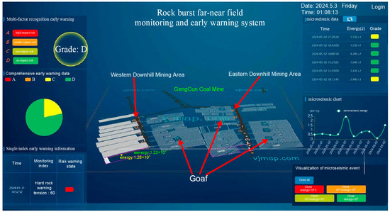 In order to further verify the accuracy of the BO-LSTM model prediction, it is compared with the far–near field monitoring and early warning system for rock bursts in the Gengcun Coal Mine. The far–near field monitoring and early warning system of rock burst is shown as Figure 10.