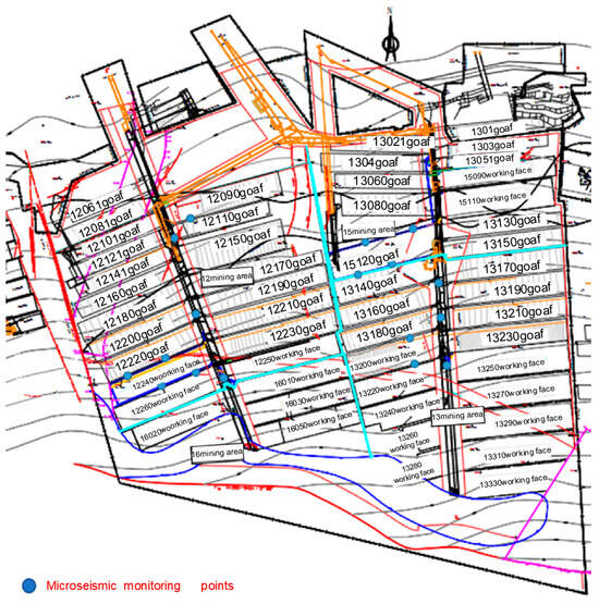 Gengcun Coal Mine microseismic measuring point layout diagram.